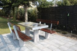 stół betonowy z krzesłami kod. 525 Wymiary blatu: 84×84 cm Wysokość stołu: 77 cm Wymiary krzesełka: 51×43 …